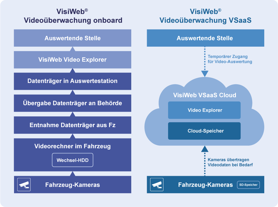 VisiWeb SaaS basiert auf einer intelligenten Architektur, bei der Bildverarbeitung und Systemsteuerung optimal verteilt sind. Teile der Logik wandern lokal ins Fahrzeug. Die intelligenten IP-Kameras übernehmen mit integrierter Rechenleistung (Edge-Computing) erste Analyse- und Verarbeitungsfunktionen direkt am Ort des Geschehens und laden Videos bei Bedarf über eine sichere LT/5G Verbindung in die Cloud hoch.