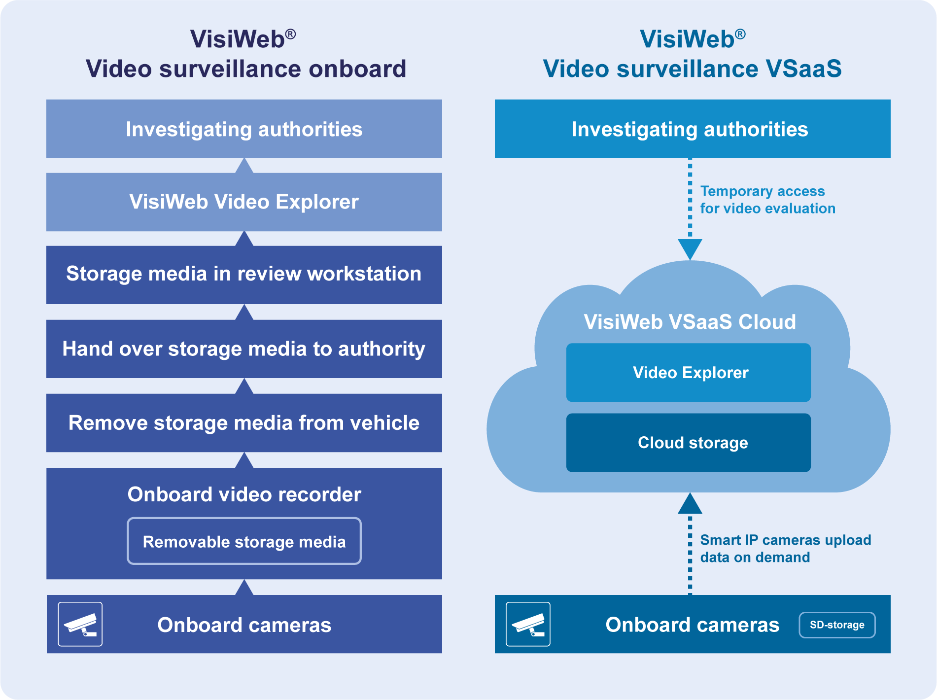 VisiWeb® VSaaS is built on an intelligent system architecture in which image processing and control functions are optimally distributed. Parts of the logic are shifted locally into the vehicle. Smart IP cameras, equipped with integrated processing power (edge computing), carry out initial analysis and processing tasks directly at the source of events and, when required, upload video footage to the cloud via a secure LTE/5G connection.
